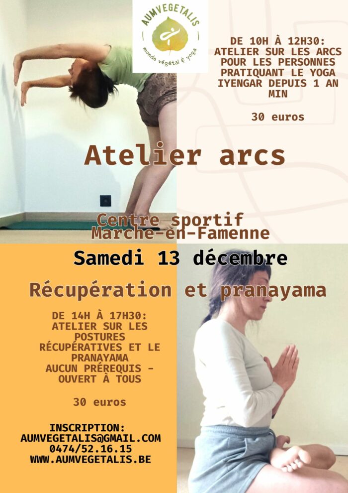 13 décembre – 10h-12h30: ateliers sur les arcs (étirements arrière – uniquement pour les personnes ayant 1 an de pratique du yoga Iyengar) – 14h30-17h: yoga de récupération et pranayama (ouvert à tous).